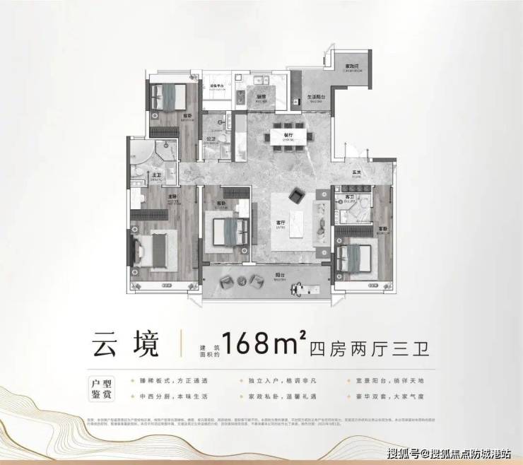 168㎡的四房户型则是进阶型客户的心头好。该户型不仅拥有超大的使用面积,还配备了专属电梯,确保了业主的隐私和安全。每一个细节都体现出高端住宅的精致与奢华。