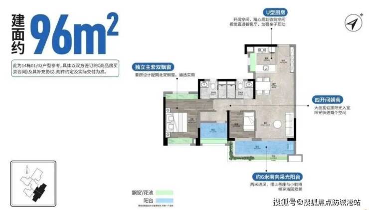 74平三房2卫,主卧双飘窗,南北对流,U型厨房5.3米景观阳台