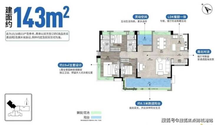 143平四房两卫,南北对流,约8.5米长阳台,西南西望园林,北向看海,主卧270度全景飘窗。