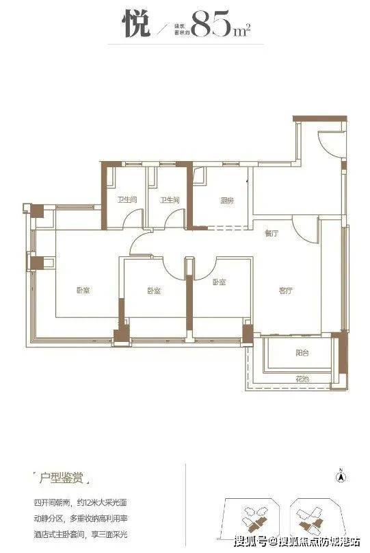 保利珠江印象主要推出建面69-113㎡的稀缺三四房户型,其中最小户型69㎡三房总价从339万元起。其户型设计注重实用性和舒适性,所有户型均能实现全南向、多开间朝南,以及270°景观面。