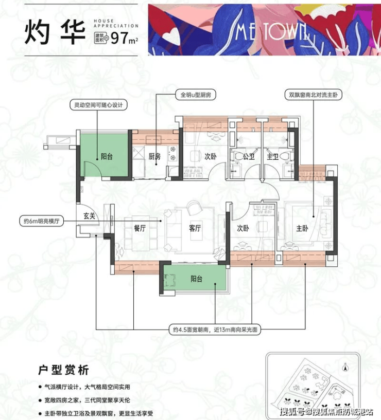 97平四房两厅两卫,做了横厅设计,餐厅、客厅、主卧、次卧,四开间朝南。