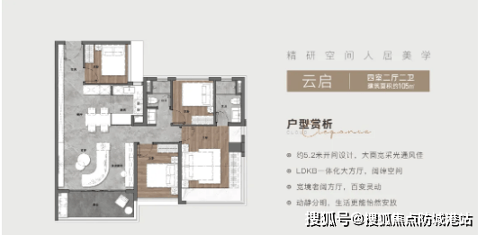 建面约105㎡四房两厅两卫:户型采用南北通透设计,空间开阔明亮。客厅与餐厅相连,打造出宽敞的公共活动区域,适合家庭聚会。四个房间布局合理,主卧套间设计,配备全景飘窗,视野极佳;其余房间可灵活规划,满足二孩家庭或三代同堂的居住需求。该户型使用率超110%,在同面积段中极具竞争力,实现了刚需面积、改善配置。