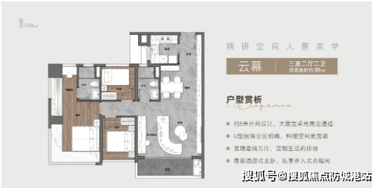 建面约88㎡三房两厅两卫:该户型为刚需首选,布局紧凑合理,无浪费空间。客厅连接观景阳台,采光通风俱佳,能俯瞰社区园林景观。主卧配备独立卫生间与衣帽间,保障主人隐私;两个次卧空间充足,可作为儿童房或书房,满足家庭多元需求。厨房采用U型设计,操作空间宽敞,动线流畅,兼顾实用性与舒适性,非常适合三口之家居住。