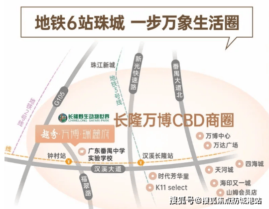 核心区位:越秀·万博·瑞麓府坐落于番禺长隆万博CBD核心板块,紧挨长隆动物世界西南侧,西侧靠近钟顺路,地理位置得天独厚。项目距离长隆万博CBD核心区域仅约5公里,开车10分钟左右即可抵达,尽享板块扩容后的发展红利。如今的长隆万博CBD已从原来的1.5平方公里扩容至7.2平方公里,规模赶超珠江新城,形成“北天河南番禺”的双核心格局,成为广州新的“宇宙中心”,左手执掌文旅顶流资源,右手拥抱总部CBD繁华,区域价值持续攀升。