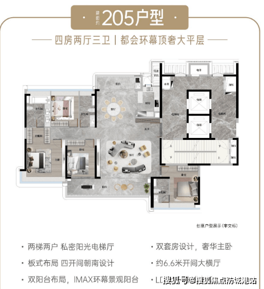 建面约205㎡奢适四房:中轴园林上的环幕景观楼王,限量级CBD低密板式高层,稀缺性十足。专梯专户设计,私属电梯门厅,最大化保障居住私密性与尊崇感;四开间朝南,南北对流阳光满格,双阳台设计搭配近9米宽巨幕阳台,可将中轴园林景观尽收眼底。双主卧套房布局,让孩子拥有独立空间,总统级主卧奢套配备步入式衣帽间、独立浴缸,打造高端居住体验。