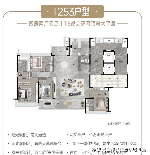 建面约253㎡定奢五房:同样为中轴园林环幕景观楼王,限量发售,定位高端改善终极置业需求。专梯专户设计,私属电梯门厅彰显尊贵;四开间朝南,南北对流,双阳台设计搭配约10.3米宽巨幕阳台,景观视野与空间感远超同级别产品。双主卧套房布局,满足多代同堂家庭的居住需求,总统级主卧奢套配备步入式衣帽间、双洗手台、独立浴缸,细节处拉满品质感,打造CBD奢居标杆。