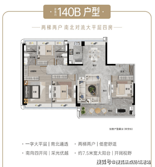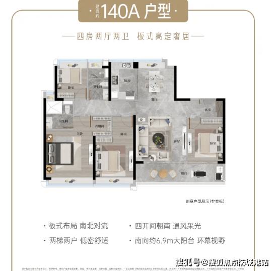 建面约140a㎡高定四房:该户型主打高性价比与景观视野,为高层景观户型,视野开阔无遮挡,可俯瞰社区园林景观。采用板式布局,南北对流设计,阳光充足,全屋精装交付,对标酒店式星级居所标准,细节处尽显品质。户型布局合理,四房空间可满足二孩家庭或刚需改善需求,动静分区明确,客厅与餐厅相连,延伸活动空间,日常居住舒适度拉满。