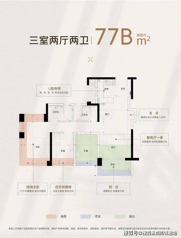 约77平方米A户型:三房两厅两卫,三面宽南向,LDKB一体化客厅与可变空间,适合小家庭。