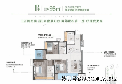 在售户型包括约85㎡三房两厅两卫、98㎡四房两厅两卫以及103㎡四房两厅两卫(横厅),均采用全南向设计,确保每户都能享受充足的阳光。超高赠送面积使得户型使用率高达94%,极大提升了居住舒适度。尤其是103㎡户型,南北通透的设计,不仅保证了通风采光,更让业主能够随时欣赏到美丽的山景。