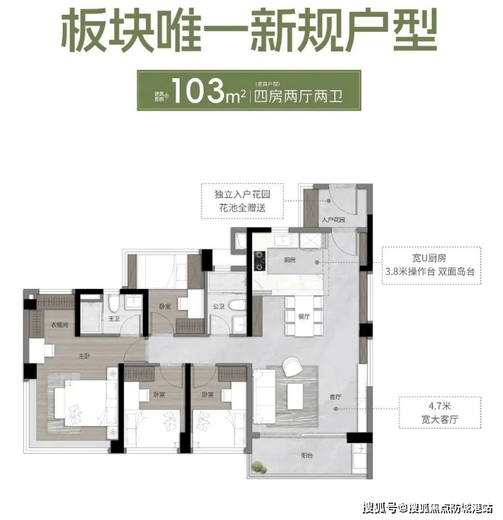 103平方米四房两厅两卫:独立入户花园,270°全景采光大主卧。