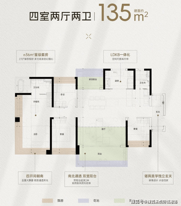 135平方米四房两厅两卫:南北通透双阳台设计,主卧开间约3.6米。
