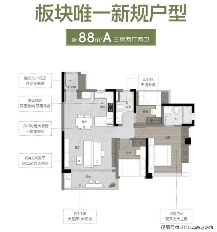 77平方米三房两厅两卫:三面宽南向设计,主卧采用270°全景舱设计,LDKB一体化客厅。
