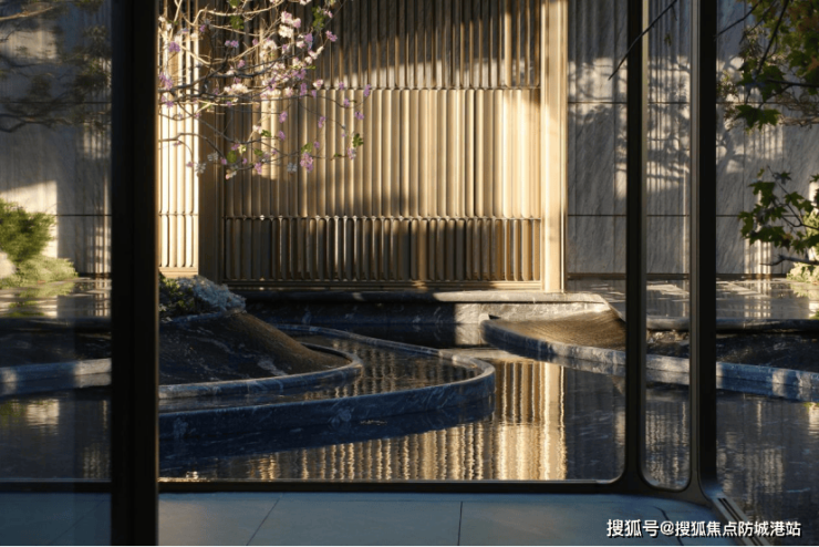 臻澐南门,以清河水流动的轨迹做伏笔,柔软中带着力量和风度,形成归家的“第一眼气场”。门庭高约6.8m、宽约29.2m,采用不对称的错落排列,精选源自印度的河流白奢石,历经多道工序,遴选、排版、切割、预拼装、打磨成波,以其天然肌理纹路,迎合清河之水的流动之姿,让奢华悄然生动。