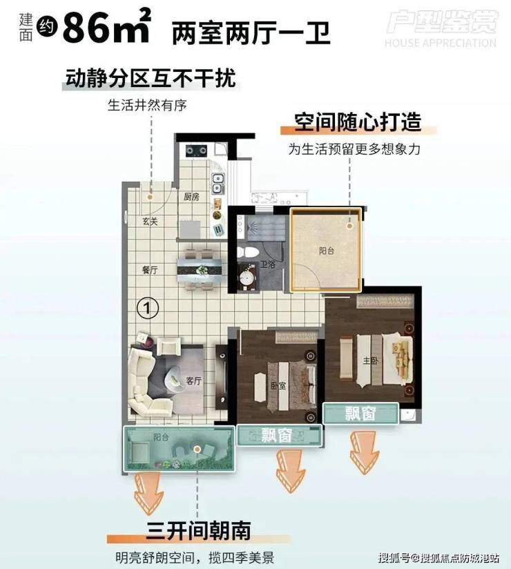 #### **85-86㎡南向两房:主力热销户型,兼顾舒适与性价比**