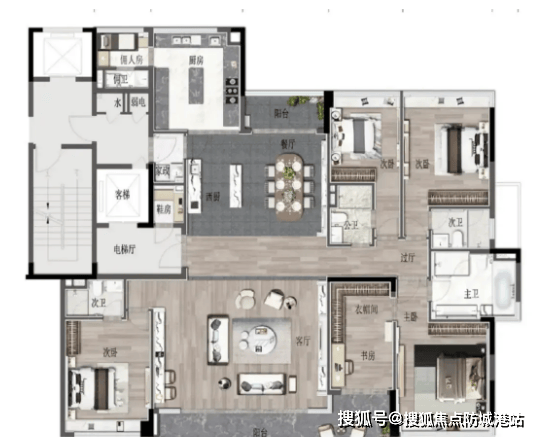 3. 房间数量与布局:四室两厅三卫,其中主卧1间、次卧2间、书房1间(可灵活改造为儿童房、老人房);主卧面积约35㎡,朝南设计,采光充足,配备独立卫生间(约8㎡)、衣帽间(约6㎡),空间宽敞,舒适度高;次卧面积分别约18㎡、16㎡,均朝南或朝东,采光通风良好,配备飘窗,可拓展使用空间;书房面积约12㎡,朝北设计,安静舒适,适合办公、阅读。