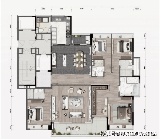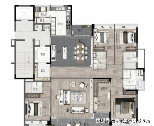 1. 户型布局:该户型为高端改善五室设计,布局方正,南北通透,采用“四叶草”布局,四个卧室分布在四个角落,互不干扰,私密性极强;客厅、餐厅、阳台形成一体化开阔空间,同时配备独立书房、茶室,满足高端家庭的社交、办公、休闲需求。