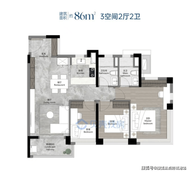 86㎡三房两厅两卫:总价约 458 万起,户型方正,空间布局合理,南向设计保证充足采光,实用率极高,满足三口之家的居住需求,是刚需改善的优选;