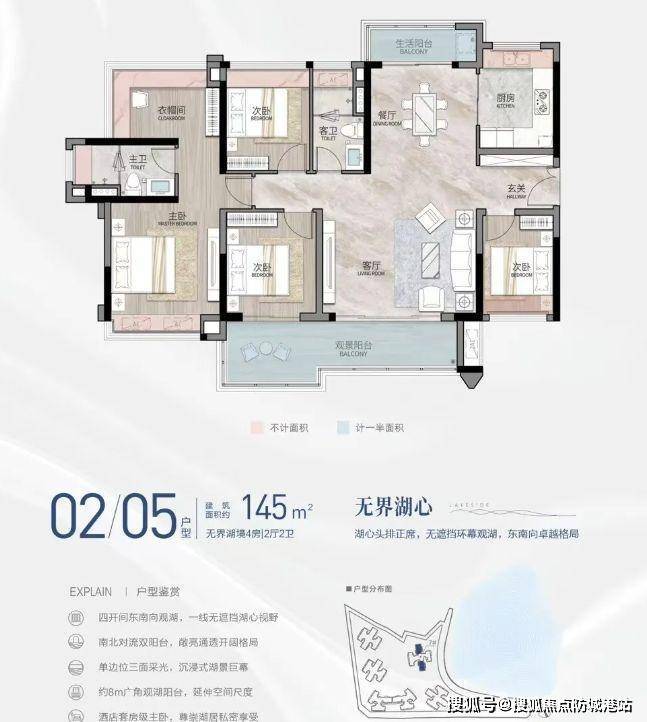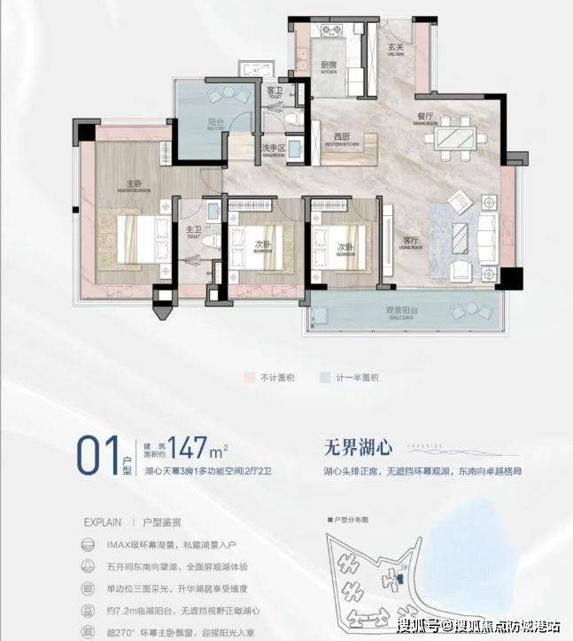 147㎡的户型堪称湖居典范,头排无遮挡私享湖心,给予业主 IMAX 震撼景观。五开间东南向望湖,让业主仿佛置身于湖景画卷之中,全方位感受湖景的魅力,享受如同空中别墅般的居住体验。