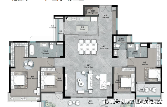 布局:南北通透,四开间朝南,大面宽、短进深,采光通风极佳,动静分离设计,客厅、餐厅相连,空间开阔大气,四个房间均为大尺寸设计,三个卫生间,满足高端改善家庭的居住需求,同时预留独立玄关、衣帽间等空间,提升居住品质。