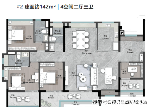 3. 建面约143㎡ 4室2厅3卫(1A栋景观楼王户型)
