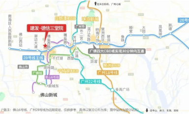 交通配套是建发德信三堂院最核心的竞争力之一。项目周边规划有佛山地铁5号线、8号线、广州地铁28号线三条轨道交通线路,未来将形成三地铁环伺的立体交通网络。其中,广州地铁28号线作为连接广州、佛山、东莞的湾区城际大动脉,设计时速160公里,在大沥设站后,将实现与广州荔湾、越秀、海珠、黄埔等核心区域的高速连接。佛山地铁5号线和8号线则串联起南海、禅城、顺德三大行政区,通达佛山各个核心板块。虽然地铁线路尚在规划阶段,但凭借广佛新干线、佛山大道、沈海高速等成熟路网,项目当前的交通通达性已经极为优越。从项目出发,约4公里即可到达千灯湖核心区,约9.5公里直达广州荔湾,约7公里到达佛山祖庙商圈,无论是自驾通勤还是公共交通出行,都极为便捷。