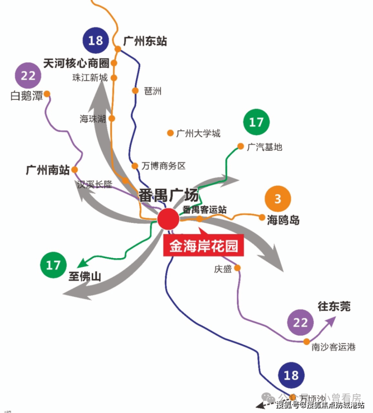 A2: 项目享有"5轨交汇”的立体交通网络,包括3号线、3号线东延线、18号线、22号线及规划中的17号线。同时,临近番禺客运站,公交、自驾出行也极为便利,可快速通达广州各区及周边城市。