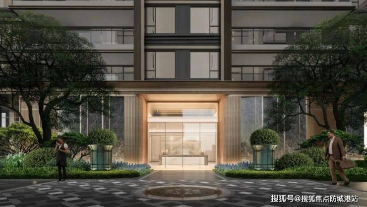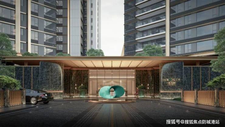 项目对标上海宝格丽酒店,打造“乾门型”入户大堂,配以“八字盈门”环抱式造型,寓意“拥抱和欢迎归家”。主入口以石材、金属、玻璃为主材打造,