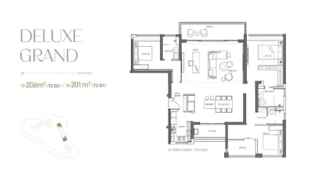 202㎡四房两厅三卫:豪华大平层设计,超大面积带来极致的空间感,所有房间均朝南或朝东,采光充足,主卧配备全景落地窗,尽享无敌山景。