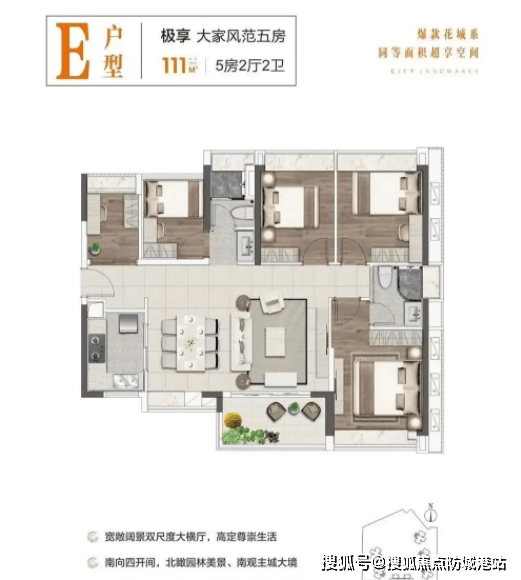 如果你的家庭人口较多,或者有改善居住的需求,那么建面约111㎡的五房两卫户型,绝对能满足你的需求。这个户型是项目的刚改主力户型,空间尺度充足,可灵活规划功能区域,适合有改善需求的大家庭居住,比如一家五口、六口,或者有三代同堂需求的家庭。