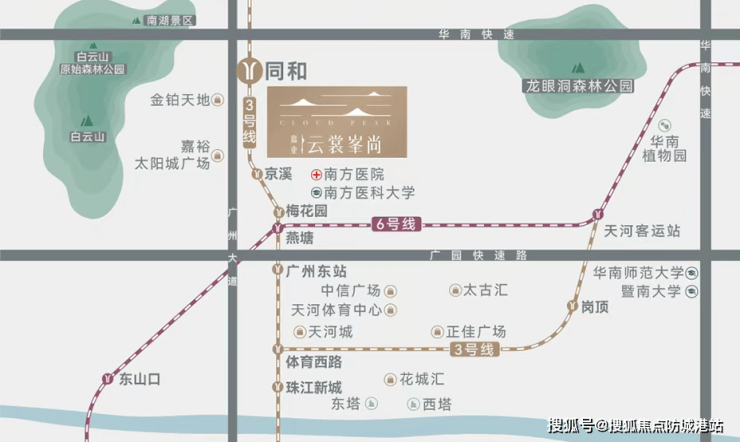 嘉业·云裳峯尚雄踞广州城市发展双中轴——白云山生态轴与广州大道城市轴交汇处,区位战略价值显著。项目距地铁3号线同和站仅约300米,4站即可直达天河核心商务区,无缝接驳珠江新城CBD。此外,项目紧邻广州大道这一南北交通主干道,并可通过华南快速、环城高速、广园快速等城市级快速路网,实现30分钟畅达广州主要功能板块,真正实现“离尘不离城”的高效通勤体验。