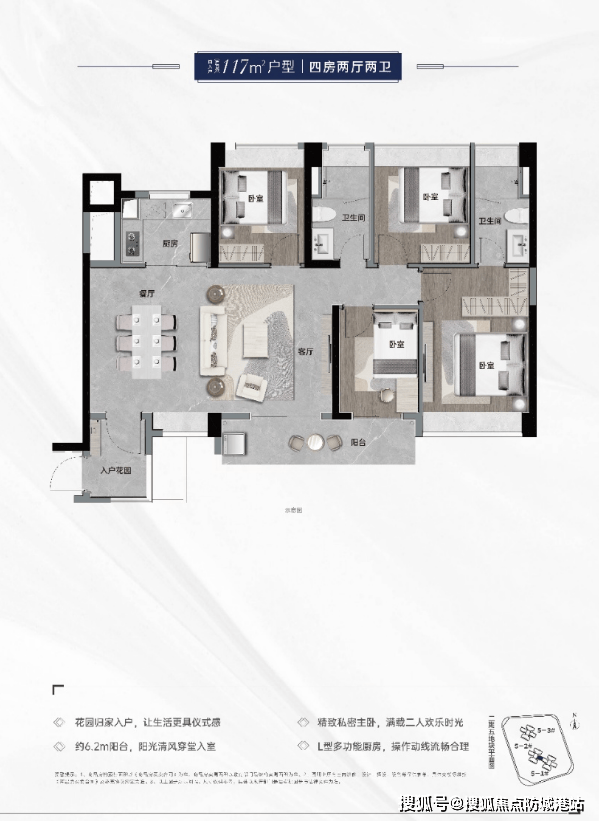 115平方米4室2厅2卫:超大阳台,南北采光通透。