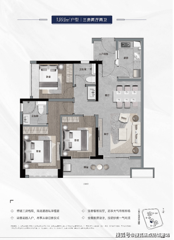 101平方米3室2厅2卫:宽敞舒适,布局合理。