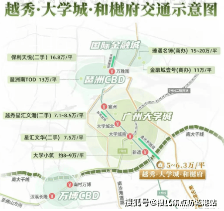 越秀大学城和樾府位于国际创新城的核心区域,紧邻地铁4号线新造站,步行距离约900米,方便快捷。此外,南大干线的开通使得自驾出行更加便利,5分钟直达万博中心;金光东隧道的通车也实现了与大学城一期的无缝衔接。周边高校林立,包括暨南大学、广州医学院等13所高校,教育资源丰富。从这里出发至琶洲、金融城也非常方便,几大黄金交通线路的开通进一步提升了项目的交通便利性。