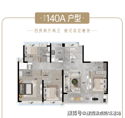 140㎡A 户型四房:实测套内面积约 128㎡,使用率 91.4%,全南向板式设计,南北对流双阳台(半赠送面积约 6.8㎡),主卧配备步入式衣帽间与独立卫浴,北望长隆野生动物世界,南瞰七大洲主题园林,景观与舒适度兼具。