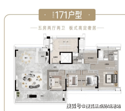 171㎡五房:8 层小高层设计,实测得房率 92.3%,专梯入户配置,实测楼间距超 90 米,无遮挡视野;四开间朝南,7.5 米景观阳台半赠送面积约 8.2㎡,适配三代同堂的改善需求。
