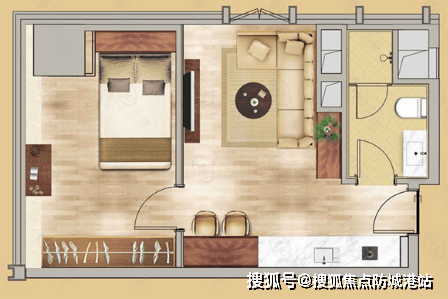 B户型(约56㎡):一房一厅一卫,3.4米层高,明厨明卫设计,动静分区合理,采光极佳,尽揽园景。