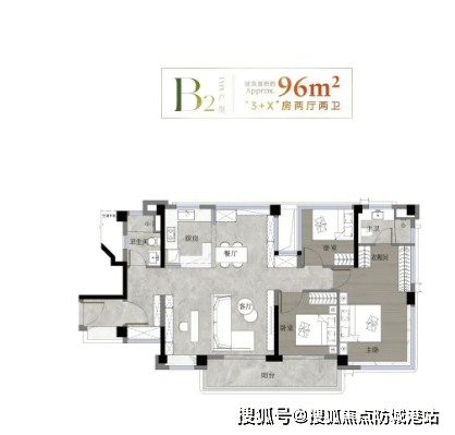 96㎡ 3+X 房两厅两卫:建面使用率 110%-118%,实际使用面积约 111-115㎡,与万科城市之光 143㎡四房(使用面积约 114㎡)相当。南北对流格局,大方厅设计提升空间通透感,外接约 4 米景观阳台,主卧套间配备步入式衣帽间,面积超 18㎡,“3+X” 灵动空间可改造为书房或儿童房,适合二孩家庭或对空间有更高需求的刚需群体。