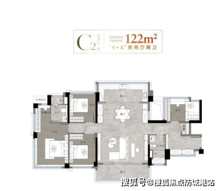 122㎡ 4+X 房两厅两卫:建面使用率超 118%,实际使用面积约 142㎡,超越万科城市之光 169㎡四房(使用面积约 136㎡)。四开间朝南布局,客厅开间达 4.8 米,外接约 7.2 米景观阳台,实测南向采光面达 17 米,主卧套间配备独立卫浴与浴缸,“4+X” 拓展空间可打造家庭影院或健身区,同时预留储物间,兼顾家庭互动与私人静谧,是改善型刚需的优质选择。