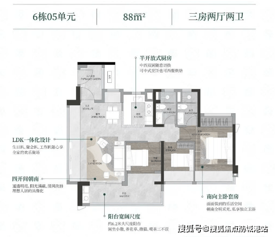 首先是建面约82平方米的三房户型。这款户型专为年轻家庭或三口之家量身定制,在有限的面积内实现了功能的最大化。其核心亮点在于“全南向”布局,确保了主要生活空间(客厅、主卧、次卧)均能享受到充足的日照。通过巧妙的空间分割,设计师将入户花园、LDK(客餐厨)一体化空间以及两个卧室进行了有机组合。特别是客厅与阳台的连通设计,使得室内空间在视觉上得到了极大的延伸,营造出开阔通透的居住感受。此外,该户型还配备了实用的收纳系统,利用墙体凹槽、飘窗等细节设计,增加了储物空间,有效解决了小户型常见的收纳难题。