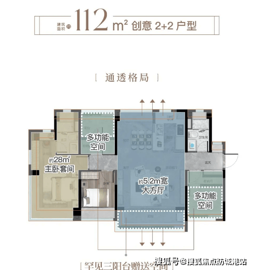 112㎡户型:性价比之选,打造区府舒适大四房,约 5.2m 方厅设计提升会客质感,罕见三阳台赠送拓展生活空间,270° 观景飘窗可瞰江,空间实用性与观景体验兼顾。