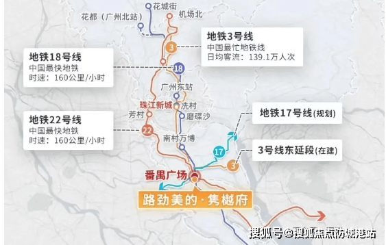 项目的地理位置堪称 “黄金区位”,位于番禺区府核心板块,紧邻番禺广场,周边聚集大量政府单位、商业体与写字楼,城市界面成熟,生活氛围浓厚。交通方面更是优势突出,距离地铁 3 号线番禺广场站仅 800-900 米,步行即可抵达。该站点是 3 号线、18 号线、22 号线与规划中 17 号线的 “四轨交汇” 枢纽,无需换乘就能直达珠江新城、琶洲等广州核心区,通勤效率极高。