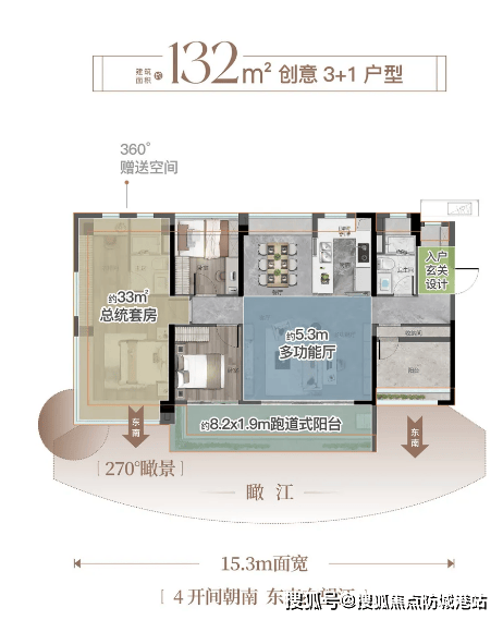 132㎡户型:改善进阶之选,约 8.2*1.9m 跑道式阳台兼具赏景与休闲功能,南望江、北瞰园,享 IMAX 无遮挡视野;尊荣入户玄关搭配 5.3m 奢阔复合厅,格局通透;约 33㎡总统级套房主卧,配备 270° 瞰景大飘窗,尽显高端居住格调。