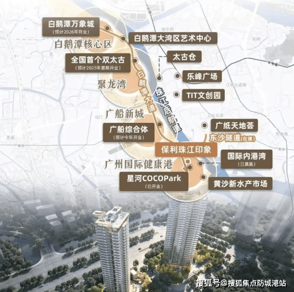 根据《广州市2025-2030国土空间规划》(穗府〔2025〕18号),白鹅潭商务区定位为“国际科创枢纽+滨江生态宜居区”,规划集聚双太古商业体(53万㎡)、万象城(26.9万㎡)、广船综合体(67万㎡)等顶奢商圈。保利珠江印象地处核心区,步行10分钟可达已开业的健康港·星河COCO Park,满足高端消费需求。