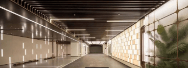 沿街商业界面与超级架空层相辅相成,呈现出一种巧妙的进退互动。深灰色的天然石材与晶莹剔透的玻璃橱窗相互映衬,营造出实与虚的完美交融。黄铜色泽的铝板作为楼层间的视觉焦点,巧妙搭配弧形倒角设计,于细腻质感中彰显人文关怀,为近人尺度带来温馨舒适的体验。