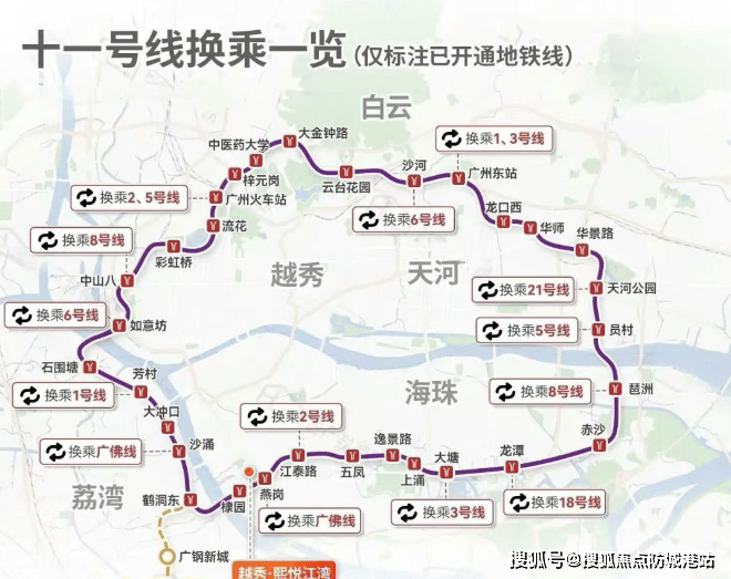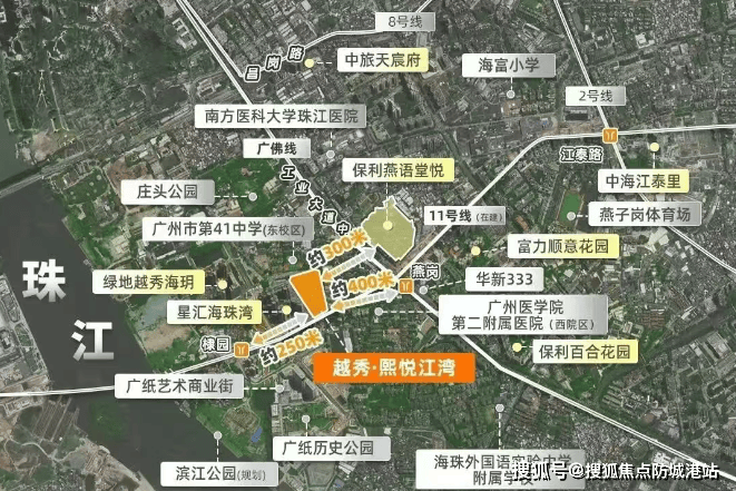 越秀熙悦江湾拥有便捷的交通网络,附近设有双地铁站:“换乘之王”广佛线燕岗站(约400米)和广州首条黄金环城线11号线棣园站(约250米),轻松连接琶洲、天河、海珠西和荔湾等重要区域。7站即可到达南站或琶洲,极大地方便了业主的出行需求。