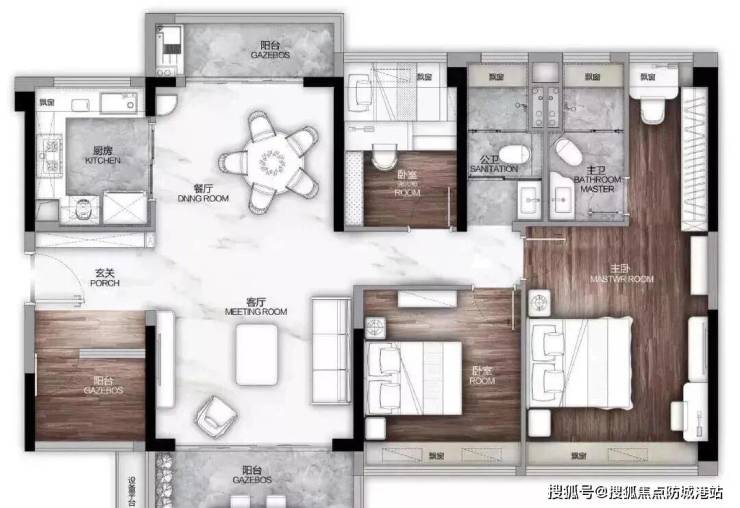 此外,餐厅、客厅还与两个阳台相连,可打造出一个“全面屏”大厅,无论是待客、休闲还是家庭欢聚,都能很好容纳。
