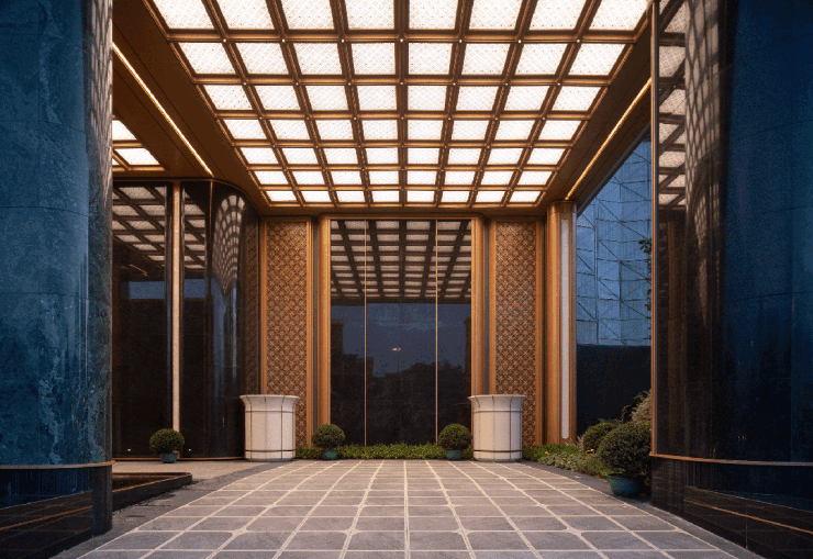 项目从归家动线开始,便营造出满满的仪式感。气势恢宏的社区主大门、采用“中央车站”设计理念的地下车库落客区(以马蹄石、大理石与透光穹顶打造)、延续铜门与玉制把手设计的单元地下门厅,共同构建了一条从城市到社区的尊崇归家通道。这种对公共空间极致打磨的态度,彰显了开发商的用心与项目的高端定位。