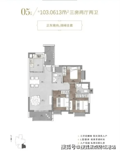 103㎡ 三房两卫:客厅面宽更大,阳台尺度升级,部分高区单位可眺望城市街景,适合三代同住或改善型家庭,总价区间336万–450万元。