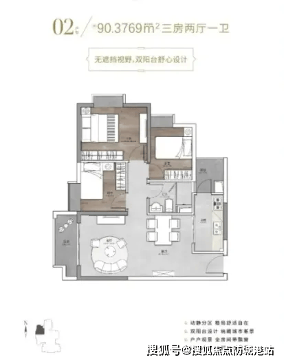 90㎡ 三房两卫:U型厨房预留冰箱位,公卫干湿分离,次卧可放儿童床,功能齐全,总价约328万元,完美适配三口之家。
