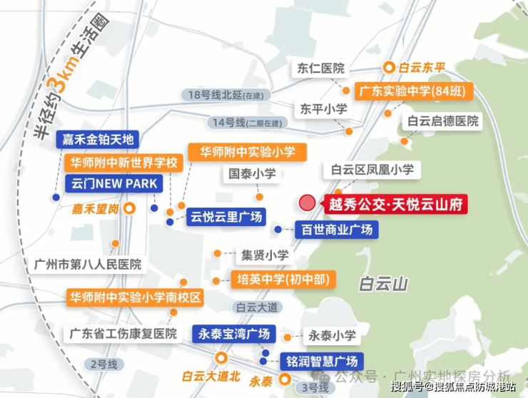 教育资源:项目周边教育资源丰富,分布有白云区东平学校(小学部)(约500米)、广附实验中学(约1.2公里)等,具体入学政策以教育局公布为准。对比同区域部分项目未配建教育设施,天悦云山府的“步行可达”优势明显。